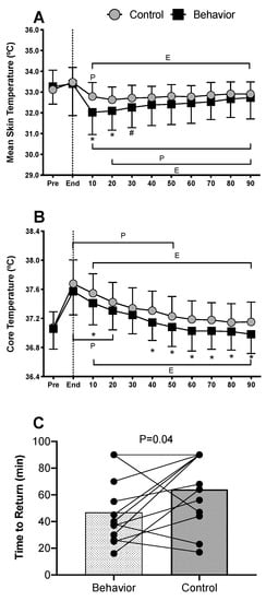 Mean skin temperature was not different between conditions at pre- (p = 0.99) or end-exercise (p = 0.99) and did not increase from baseline during exercise in either condition (p ≥ 0.06). Mean skin temperature decreased from the end-exercise time point in both conditions within the first 10 min of recovery (p < 0.01), was reduced to a greater extent in the behavior trial compared to the control trial within the first 10 min (by −0.8 ± 1.0 °C) and remained lower through 20 min of recovery (p ≤ 0.01) (Figure 1A). Core temperature was not different between control and behavior trials at pre- (p = 0.99), during, or end-exercise (p = 0.18), but increased within the first 20 min of exercise in both conditions (p < 0.01). Core temperature began to decrease within the first 10 min of recovery in both trials (p ≤ 0.02) and returned to pre-exercise levels within 40 min of recovery in the behavior trial (p = 0.38), but not until 60 min in the control trial (p = 0.12). Core temperature was different in the behavior compared to control trial at 10 min, and 40–90 min during recovery (p < 0.05) (Figure 1B). Notably, core temperature returned to pre-exercise levels quicker in the behavior compared to control trial (47 ± 25 vs. 64 ± 27 min, p = 0.04) (Figure 1C).