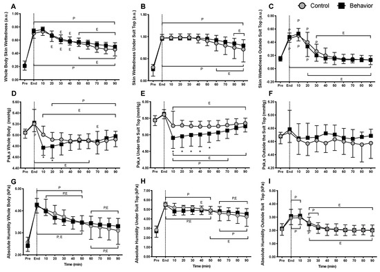 Skin wettedness, absolute skin humidity, and the saturated vapor pressure at the skin (Psk,s) (n = 12, mean ± SD). (A) Whole body skin wettedness, (B) under suit top skin wettedness, (C) outside suit top skin wettedness, (D) whole body absolute humidity, (E) under suit top absolute humidity, (F) outside suit top absolute humidity, (G) whole body Psk,s, (H) under suit top Psk,s, (I) outside the suit top Psk,s, during 90 min of recovery from low intensity cycling exercise. P Different from pre-exercise (p ≤ 0.04); E Different from end-exercise (p ≤ 0.05); * Behavior different from control (p ≤ 0.05).