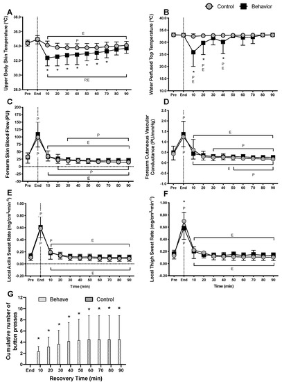 Thermoeffector responses (n = 12, mean ± SD). (A) Upper body skin temperature; (B) Water perfused top temperature; (C) Forearm skin blood flow; (D) Forearm cutaneous vascular conductance; (E) Local axilla sweat rate; (F) Local thigh sweat rate (n = 6); (G) Cumulative number of button presses, during 90 min of recovery from low intensity cycling exercise. P Different from pre-exercise (p ≤ 0.01); E Different from 60 min (end-exercise) (p < 0.02); * Behavior different from control (p ≤ 0.05).