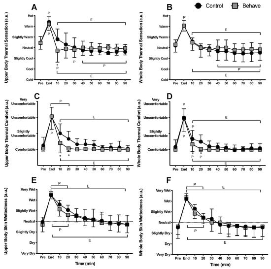 Perceptual responses (n = 12, mean ± SD) of (A) upper body thermal sensation, (B) whole body thermal sensation, (C) upper body thermal discomfort, (D) whole body thermal discomfort, (E) Upper body skin wettedness and (F) whole body skin wettedness during recovery from low intensity exercise. P Different to pre-exercise (p ≤ 0.05); E Different to end-exercise (p < 0.01); * Behavior different from control (p ≤ 0.03).