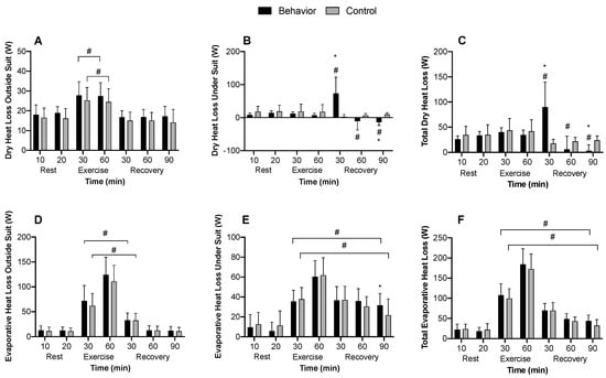 Dry and evaporative heat loss (n = 12, mean ± SD). (A) Dry heat loss outside the suit top, (B) dry heat loss under the suit top, (C) total dry heat loss, (D) evaporative heat loss outside the suit top, (E) evaporative heat loss under the suit top, (F) total evaporative heat loss during 90 min of recovery from low intensity cycling exercise. # Different from 60 min (end-exercise) (p < 0.01); * Behavior different from control (p ≤ 0.05).