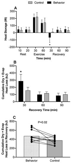 Dry heat loss outside of the suit top was not different between trials but increased during exercise in both trials (p < 0.01) (Figure 5A). Dry heat loss under the suit top was elevated during the first 30 min of recovery in the behavior compared to control trial (p < 0.01). However, there was dry heat gain at 90 min into recovery in the behavior compared to control trial due to lower skin temperatures gaining heat from the water perfused top (p < 0.01) (Figure 5B). Overall, total dry heat loss was greater at 30 min in behavior compared to control (p < 0.01) but was less at 90 min compared to control (p = 0.03) (Figure 5C). Evaporative heat loss outside of the suit top also did not differ between trials during exercise (p ≥ 0.51) but increased and remained elevated at 30 min into recovery for both conditions (p < 0.01) (Figure 5D). Evaporative heat loss under the suit top was greater only at 90 min of recovery in the behavior compared to control trial (p = 0.01). Otherwise, both conditions had greater evaporative heat loss throughout exercise and recovery compared to baseline (p < 0.01) (Figure 5E). Total evaporative heat loss was not different between behavior or control trials at any time point (p ≥ 0.45), but increased in both conditions during exercise and remained elevated throughout recovery (p < 0.01), except at 90 min in the control trial, where it was not different to pre-exercise levels (p = 0.25) (Figure 5F). At 30 min recovery, total heat storage was negative (Figure 6A), and cumulative heat loss greater (Figure 6B), indicating augmented heat loss in the behavior compared to control trial (p < 0.01). All other time points saw similar heat storage (Figure 6A) which increased during exercise in both trials (p < 0.01). There was greater cumulative dry and evaporative heat loss in the first 30 min of recovery (p < 0.01) (Figure 6B), but no differences in the 60 and 90 min recovery time points (p ≥ 0.46). Total (i.e., sum of) cumulative dry and evaporative heat loss was greater in the behavior trial compared to the control trial during recovery (p = 0.02) (Figure 6C).