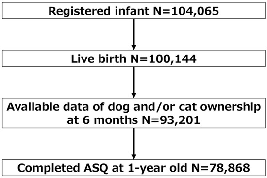 Of the 104,065 fetal records included in the cohort, 100,144 were live birth. Among participants of JECS, those with available data of dog and/or cat ownership at six months and data for the ASQ-3 at 12 months were included in this study (n = 78,868) (Figure 1).
