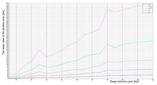 The graphic comparison of position errors is shown in Figure 4 and depends on the selected constants. The graph shows that the greater the pseudo-range error and distance, the greater the position error ErrP. Therefore, we can assume that this method is not suitable for a user that is at a remote location more than 40 km from any source of signal transmission. Sufficient accuracy could be achieved when the signals were transmitted in a radius of 40 km. Therefore, the receiver should consist of algorithms that recognize the intensity of the incoming signals and select the strongest one to calculate their own position.