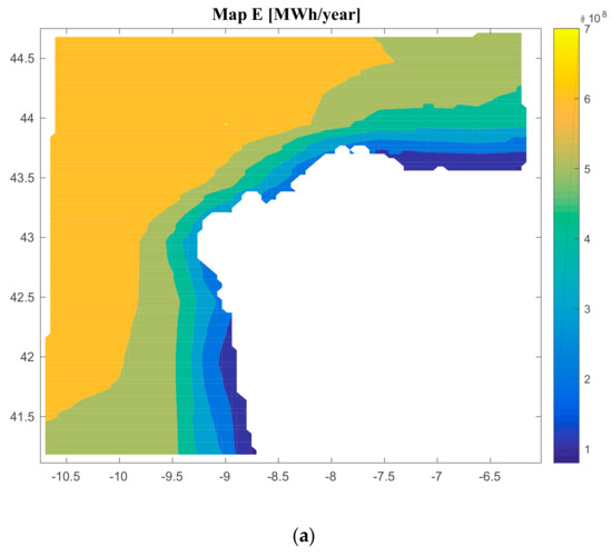 In addition, the map inputs (scale parameter of the offshore wind resource, shape parameter of the offshore wind resource, distance from farm to shore, distance from farm to shipyard, distance from farm to port, height of waves, period of waves, and bathymetry) generate a map of the energy produced in the specific location selected.