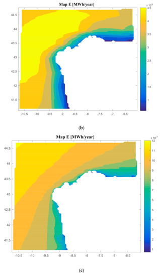 The software created calculates the energy produced by a floating offshore renewable energy farm. In the particular cases of study of this paper, the energy produced by a floating offshore renewable energy farm composed by offshore wind turbines (Figure 7a), offshore wind and waves (different platforms) (Figure 7b), offshore wave energy (Figure 7c) and offshore hybrid platform (wind and waves in the same platform) (Figure 7d), has different values depending on the type of technology selected. The values go from 79,500,000 MWh/year to 701,000,000 M€/year for case 1; from 58,890,000 MWh/year to 497,340,000 M€/year for case 2; from 7,087,500 MWh/year to 121,110,000 M€/year for case 3; and from 37,843,000 MWh/year to 312,220,000 M€/year for case 4.