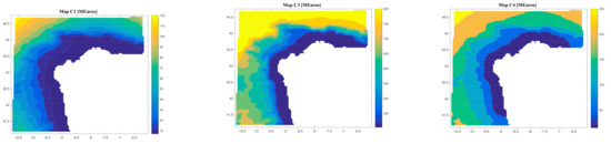 Figure 8, Figure 9, Figure 10 and Figure 11 are the maps of results for case 1, case 2, case 3 and case 4 respectively. It is important to notice that results of all the maps depend on the shape and scale parameters of the offshore wind resource, the distance from farm to shore, distance from farm to shipyard, distance from farm to port, the height and the period of waves and the bathymetry of the location of study (in this case the Galician region). This fact is shown in Figure 8, Figure 9, Figure 10 and Figure 11. Of course, the maps of results depend on the inputs, therefore this software is valid for all the locations that user wants.