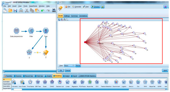 IBM SPSS Modeler 14.2 (IBM, Arnmonk, NY, USA) and Netica 5.18 (Norsys Software Corp, Vancouver, BC, Canada) were selected to construct the BN model for analysis and reasoning, respectively. IBM SPSS Modeler is a widely used software package for data mining, in which the Bayesian modeling function has advantages in parameter learning. In addition, the interface is simple, and the graphs generated by the BN have a good visualization effect. Netica is another widely used BN software package that has strong reasoning ability for risk prediction and cause diagnosis of accidents. Therefore, IBM SPSS Modeler 14.2 was used to construct a BNMBCA to generate the network topology and its corresponding CPT with different unsafe behaviors as the root nodes. Then, the constructed model was rebuilt in Netica 5.18 for forward and backward reasoning.