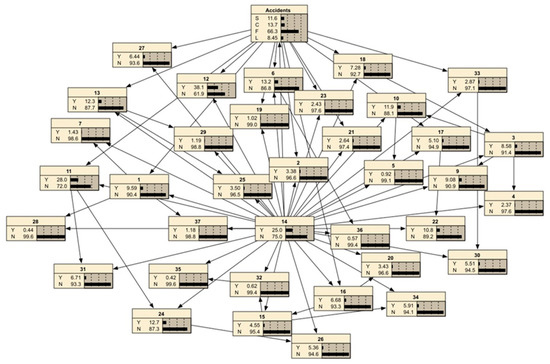 Before the forward and backward reasoning of the BNMBCA, an unsafe behavior node should be identified as the root node. The root node should meet two requirements: (i) The identified unsafe behavior occurs frequently in the four types of accidents, and (ii) the identified unsafe behavior contributes to the occurrence of the four types of accidents. The contribution of an unsafe behavior to the occurrence and development of a certain type of accident is defined as the accident attribute of the unsafe behavior, and the strength of the accident attribute reflects its degree of contribution. Therefore, an unsafe behavior node with a weak accident attribute was selected as the root node. Based on the statistics, the occurrences of several unsafe behaviors in the four types of accidents are shown in Table 3. It can be seen that B14 (engage in specialized operation without a permit) occurs frequently and contributes to the four types of accidents. Thus, B14 is suitable for selection as the root node, and then the structure of the BNMBCA built by IBM SPSS Modeler 14.2 is rebuilt by Netica 5.18 for forward and backward reasoning.