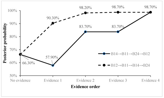 When certain unsafe behaviors occur at a building construction site, the probability of the four types of accidents can be predicted by the forward reasoning of the BNMBCA. However, the rationality of the BNMBCA should be verified first. Using the collected accident cases, predictions without and with evidence are compared to prove the rationality of the BNMBCA. Additionally, the impact of multiple unsafe behaviors on accidents is further explored. Two accidents were selected for analysis; the first is a fall accident, and the chain of unsafe behaviors is “B14→B11→B24→B12”. With no evidence prediction, the prior probability of root node B14 (engage in specialized operation without a permit) is identified as 25% according to the rate of this unsafe behavior in contributing to the four types of accidents. Then, the posterior probabilities of the accidents are 11.6% (S), 13.7% (C), 66.3% (F), and 8.4% (L). The visualization of the BNMBCA is shown in Figure 3. With evidence prediction, B14 is initially inputted as the evidence node, the posterior probability of F decreases to 57.9% and the posterior probabilities of S, C and L slightly increase. Then, B11 (implement inadequate protection measures for holes or borders), B24 (do not use up safety net as required), and B12 (do not use all personal protective equipment (PPE)) are input in order as evidence nodes, and the posterior probability of F sharply increases to 98.7%. The result indicates that falling is most likely to occur when these unsafe behaviors occur. By changing the input order of these evidence nodes, the growth rate of F changes. That is, the accident attributes of these unsafe behaviors are different. The posterior probability of F greatly increases when B11 and B12 are evidence nodes, so these two unsafe behaviors have strong accident attributes, while B14 and B27 have weak accident attributes. However, the final posterior probability of F is still 98.7%, and this does not change with the change in input order for the evidence nodes. Figure 4 reflects the change in the trend of the posterior probabilities of F when the input orders of the evidence nodes are “B14→B11→B24→B12” and “B12→B11→B14→B24”, respectively.