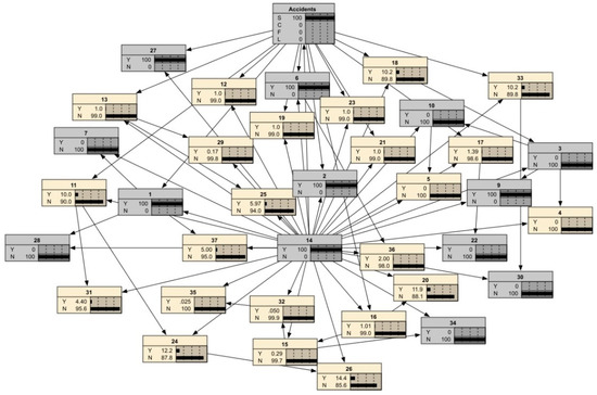 Taking the S accident type as an example, the accident probability is adjusted to P(A) = 100%, and the largest posterior probability is P(B14 = Y) = 33.3% after probability updating, so B14 is identified as a critical unsafe behavior. To prevent this type of accident, increased attention should be given to checking whether specialized operators have received professional training and obtained permits. Then, P(B14 = Y) = 100% is adjusted to continue the diagnosis process. Considering the occurrence of unsafe behaviors in the S accident type among the 303 accident cases, unsafe behaviors with a frequency higher than 8% are identified as potentially happening, and otherwise as not happening. When P(B14 = Y) = 100% is input, the largest posterior probability is P(B6 = Y) = 46.0%. Additionally, the occurrence of this unsafe behavior is higher than 8%, and so it is determined to be the second critical unsafe behavior. During building construction, potential unsafe behaviors of machine operators need to be addressed to prevent the S type accidents. The diagnosis process is completed when the posterior probabilities of all the remaining unsafe behaviors are less than 15%. As shown in Figure 5, the critical group of unsafe behaviors is identified as {B14, B6, B9, B1, B2, B27}.