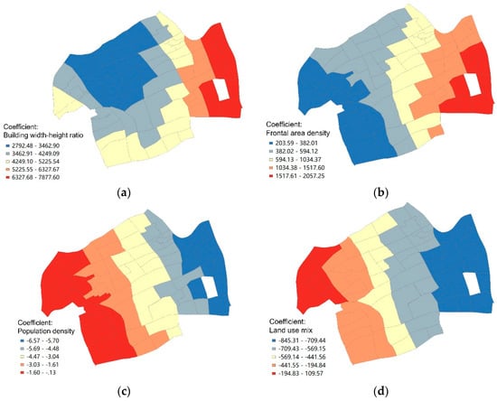 The overall R2 and adjusted R2 of the model, which reflected the fitness of the geographical weighted regression, was 0.644 and 0.552, respectively. The local R2 ranged from 0.32 to 0.64 from the west to the east of Jing’an District. This indicated that the local fitting degree of the model in the eastern neighborhoods was better than that in the western neighborhoods (Figure 3).