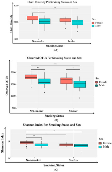 Boxplots of the three studied alpha diversity metrics: (A) Chao1 (community richness), (B) observed OTUs (community uniqueness), and (C) Shannon (community evenness or entropy). Red boxplots represent females and green boxplots represent males. Statistically significant differences were determined using analysis of variance with alpha diversity as the response variable, and smoking status and sex as crossed predictor variables, with Tukey’s HSD for group-specific differences. * Statistically significant at adjusted (p-value < 0.05), ** Statistically significant at adjusted (p-value < 0.01) and *** Statistically significant at adjusted (p-value < 0.001).