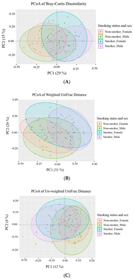 Principal Coordinates Analysis (PCoA) of the distance matrix generated using three distance metrics: (A) Bray-Curtis dissimilarity data, (B) Weighted UniFrac, and (C) Unweighted UniFrac. The x and y axes correspond to the first and second major principal coordinates (PC1 and PC2) identified from the PCoA analysis. Each principal coordinate explains a certain fraction of the variability (indicated by the percentage between brackets on each axis) observed in the data set. The principal coordinates PC1 and PC2 are plotted to create a visual two-dimensional (2D) representation of the multidimensional microbial community compositional differences between tested samples. Each sample is represented by a point and colored based on the smoking status and the sex of tested human subjects: Female non-smokers (red), male non-smokers (green), female smokers (teal green), and male smokers (magenta). The distance between the points represents the similarity of those samples (closer together = more similar).