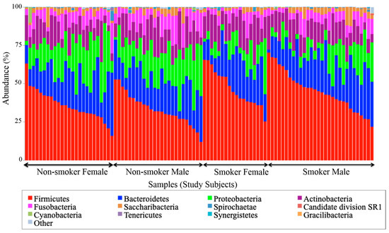 Taxonomic composition represented by the abundance (percentage) of phyla per smoking status per gender for each sample in each comparison group.