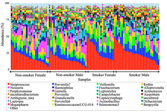 Stacked bar charts (precisely, 100% stacked) were used for the visualization of the taxonomic profiling results generated from abundance data in OTU tables. These charts enabled the display of the composition and the distribution of most abundant bacterial taxa at the phyla (Figure 4) and genera (Figure 5) levels across 100 studied salivary samples from smokers and non-smokers. Two samples were dropped out of the analysis because of some missing demographic data about them to avoid any type of uncertainty errors. Both Figure 4 and Figure 5 clearly show that the taxonomic identity and distribution of the salivary microbiota were conserved among all tested samples from smoker and non-smoker human subjects at phyla and genera levels. At the phylum level, our results revealed that that the salivary microbiome was largely predominated by Firmicutes, Bacteriodetes, Proteobacteria, Actinobacteria, Fusobacteria, and Saccharibacteria.