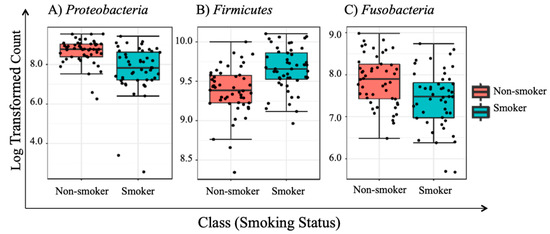 To test if there are any statistically significant differences in the abundance of abundant taxa between smokers and non-smokers, we performed both parametric and non-parametric univariate analyses. Non-parametric univariate analyses relied on Mann–Whitney and/or Kruskal-Wallis (which is an extension to Mann–Whitney test to test for more than two samples) tests. Our results revealed that three abundant phyla including Proteobacteria, Firmicutes, and Fusobacteria, showed statistically significant differences in abundance between smokers and non-smokers. The false discovery rate (FDR) values reported in Table 3 were used to assess statistical significance of the univariate analysis results setting the cutoff at 0.05.