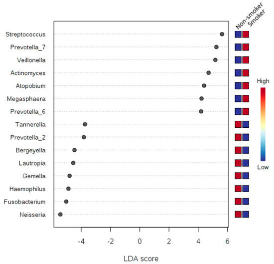 A plot of the LDA scores of the top 15 genera showing statistically significant differences between smokers and non-smokers. LDA scores on the x-axis and genera on the y-axis. The color-coding in the squares of the right side of the plot refers to the cumulative abundance of each genus in each binned group, where red means high cumulative abundance and blue means low cumulative abundance.