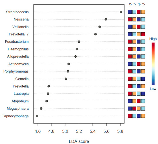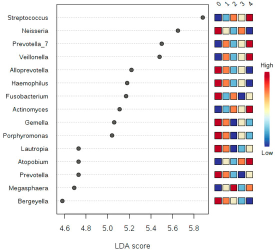 A plot of the LDA scores of the top 15 genera showing statistically significant differences between binned years of smoking. LDA scores on the x-axis, and genera on the y-axis. The color-coding in the squares of the right side of the plot refers to the cumulative abundance of each genus in each binned group, where red means high cumulative abundance and blue means low cumulative abundance.