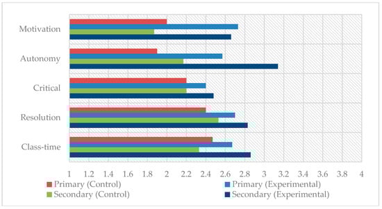 The results in Table 4 contain the scores obtained for the control groups (traditional methodology) during the application of the teaching unit in each educational stage. In general, the results obtained for the control group are very low. Of the nine variables analyzed, only one in primary education exceeded the central score (M ≥ 2.5) in the secondary stage. In primary education, no variable exceeded the central score. The variables with the highest score in the traditional methodology were the use of class time in primary education and the resolution of problems in secondary education. The interaction of students with the teacher and with classmates reached very low values.