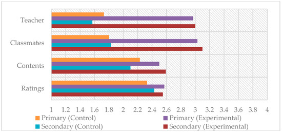 The scores obtained for the experimental groups (Table 5) reflect the optimal effectiveness of inverted learning. Of the nine variables analyzed, the use of flipped learning allowed them to exceed the central score (M ≥ 2.5) for eight of the variables in primary and secondary education. Interaction with the teacher and with classmates are the most potent variables in both stages, in addition to autonomy in secondary education. In both educational stages, critical thinking is the variable with the lowest score, but it is very close to the central score (M = 2.4 and M = 2.48, respectively).
