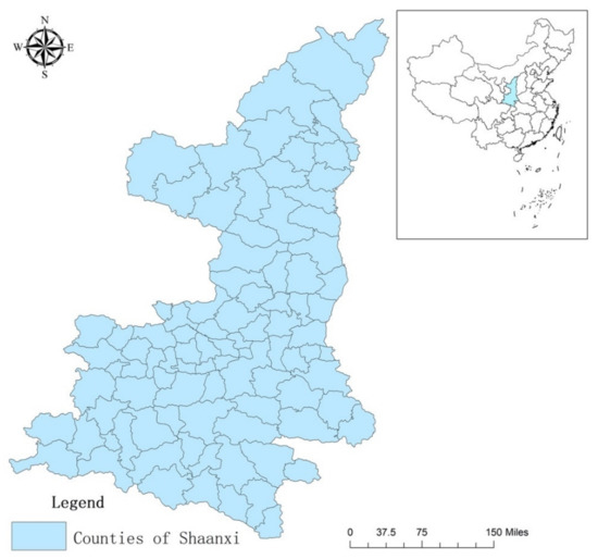 Figure 1). It is a long and narrow province with high terrain in the north and south, and low terrain in the middle. From north to south, Shaanxi can be divided into three geomorphic regions: the northern Shaanxi plateau, the Guanzhong plain, and the Qinba mountain. The total land area is 205,600 km