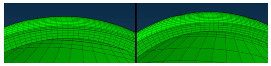 Patient-specific corneal tomographies were exported, and preoperative Cartesian coordinates for the anterior and posterior corneal surfaces were interpolated using 8th order Zernike polynomials [6]. The mean Zernike fitting error was 1.10 ± 0.19 μm. The geometries were meshed with 8-node 3D hexahedral brick elements with custom software (SpecifEye v0.9, OptoQuest, Cleveland, OH, USA). The corneal mesh was divided into 4 and 2 distinct layers for LASIK and PRK, respectively. The LASIK model consisted of epithelium, anterior stroma incorporated into the flap, the flap-residual stroma interface wound and residual stroma, while the PRK model included only epithelium and residual stroma (Figure 1). The mesh consists of 6 layers in both LASIK and PRK models. The cornea and sclera were each meshed using 6750 elements. The number of elements in the axial direction was selected based on a mesh convergence analysis. A 6-element mesh was selected based on sensitivity analysis to optimize the computational duration, summarized in Table 1, in which changes in maximum principal strain and displacement values were less than 1.0%. The sensitivity analysis reduces the likelihood that differences between PRK and LASIK will arise merely from mesh idiosyncrasies. The epithelium, sclera, and limbus were modeled as hyperelastic incompressible neo-Hookean material using Wmatrix = c(I1–3), where I1 is the first deviatoric invariant of the left Cauchy–Green deformation tensor and W is the strain energy density function. The value of c for the epithelium was set to 0.002 megapascals (MPa), 5% of the corresponding value for stroma (see below), to reflect the negligible contribution of the epithelium to the mechanical behavior of the cornea while still allowing model convergence. The value of c was set to 0.16 and 0.2 MPa for limbus and sclera, respectively, both of which were represented as isotropic materials. The scleral value was based on a scleral shear modulus value from experimental data [7] and scaled down for the limbus. This assumption served to acknowledge the limbus as a distinct mechanical region while avoiding a material stiffness discontinuity between cornea and sclera. The stroma was represented as a nonlinear, anisotropic, hyperelastic, nearly incompressible material with depth-dependent material properties [5]. A microstructural fibril-reinforced material model representing collagen fibrils was combined with an isotropic Neo-Hookean solid extrafibrillar matrix to produce a composite corneal stroma. The cornea fibrils were represented as linear helical springs, and crimping-uncrimping behavior of these fibrils was reflected using an algorithm given by Freed et al. [8,9,10]. This equation was combined with a probability density function reported by Pinsky et al. [11] to demonstrate fibrils’ distribution within the cornea based on Meek’s [12] X-ray scatter findings. Like most biological soft tissues, the cornea exhibits some viscoelastic behaviors but is modeled here, as in prior studies [5,12], with hyper-elastic material properties.