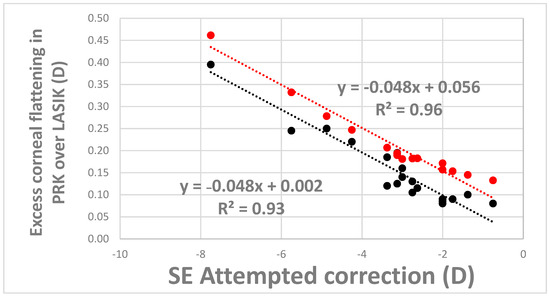 Additional corneal flattening observed in PRK over those observed in LASIK from simulations (black group), and global historical nomogram (red group) plotted as a function of attempted spherical equivalent (SE) refractive error. (D: Diopters).