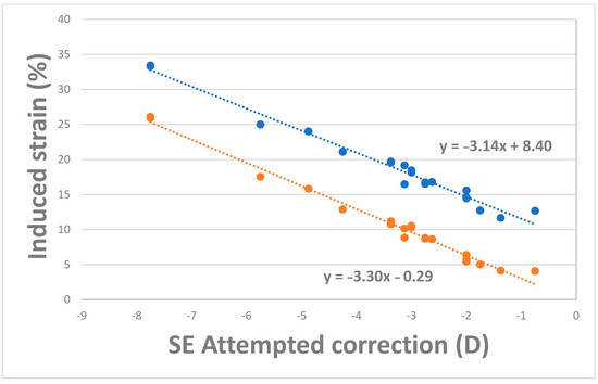 Post-surgical increase (given as a percentage) in average MPS as a function of SE of the correction for LASIK (blue) and PRK (orange), SE: spherical equivalent (diopters), MPS: Maximum principal strain.