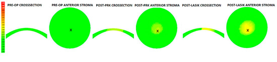 Example of maximum principal strain (MPS) maps for full-thickness vertical cross-sections and en face anterior stromal regions for pre-operative, post-PRK, and post-LASIK simulations, respectively. Strain maxima are indicated by an ‘x’ on the map. Higher MPS values were incurred in LASIK than in PRK in all cases.