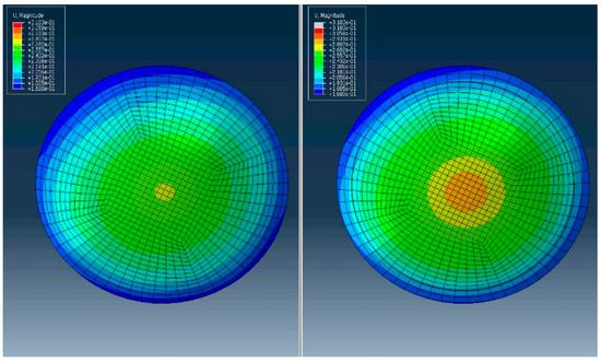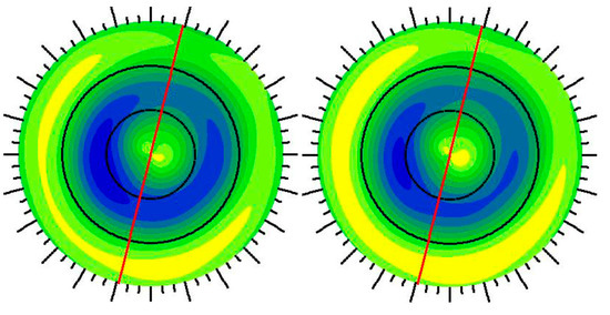 Higher displacements in response to a physiologic IOP were observed in post-LASIK than post-PRK corneal models. Displacement maps for post-PRK (left) and post-LASIK (right) models are compared in Figure 5. Axial curvatures for the same post-PRK (left) and post-LASIK (right) models are demonstrated in Figure 6.