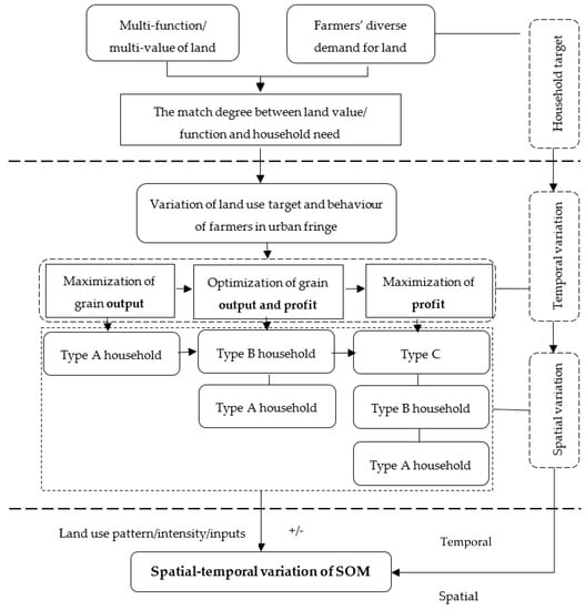 Figure 1). Therefore, farmers’ land use target presents some spatial-temporal variation. Farmers per se evolve from pure farmers (Type A) (Note: Type A household refers to household whose income mainly comes from farming; Type B household refers to household who has concurrent off-farm employment, but farming is still the major income source; and Type C household refers to household who has a concurrent off-farm employment, but off-farm income becomes the major income source) to concurrent farmers who focus on farming (Type B) and then to concurrent farmers who focus on off-farm employment (Type C). On this basis, the spatial-temporal variation of SOM contents is likely to be closely related to the evolvement of the type of farmers. This can be elaborated as follows.