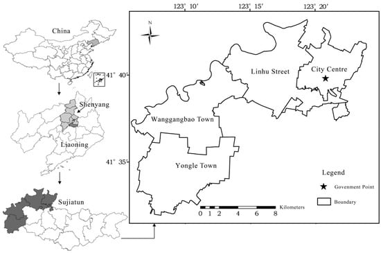 We selected Sujiatun district in Shenyang City, the sole megacity in the three provinces in northeastern China, as the study site. Sujiatun district (123°09′–123°47′ E, 41°27′–41°43′ N) is situated in south Shenyang, which is 15 km from the city center and has a total area of 782 km2. It is located in the north temperate zone which is characterized by a sub-humid continental monsoon climate, rainy (dry) season coincided with high (low) temperature, abundant sunshine, and concentrating precipitation. The average annual temperature is 8 °C, the average annual precipitation is 659.6 mm, and the annual sunshine is 2527 h. It is located in the transitional zone of Liaodong Hill and Liaohe Plain with topography sloping from the east to the west. The topography of Sujiatun district is complicated: with mountainous area in the east, hilly area in the middle and plain area in the west. The east hilly area takes up 17% of the total area with an elevation varying between 150–250 m. Most of the area is forestland with the slope varying between 15–25°. The middle mountainous area occupies about 33% of the total area with an elevation lying between 70–100 m. It is the major producing area of upland crops and oil plants. The rest 50% of the total area is the west plain, with an elevation of 30–40 m. The alluvial plain in west area is flat which makes it the major zone of modern agriculture.
