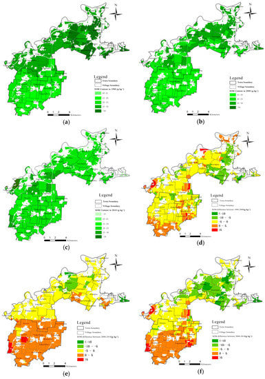 In general, the SOM contents in the three towns have been declining over the 30 years. The SOM grade has been moving from high and low grades to medium grade. From the perspective of spatial variation, the range of SOM contents variation was −5–0 g/kg during 1980–2000 (see