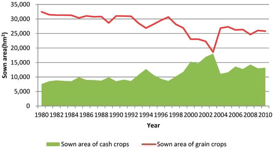 2 per year. The decline was relatively obvious since 2000. In 2003, the sown area of grain crops was basically the same as that of cash crops.