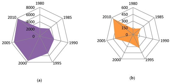 Figure 6 shows the change of sown areas for vegetables and fruits, respectively. The change of vegetable planting area has experienced three stages. In the first stage (1980–1990), the area increased slowly from 2271 hm