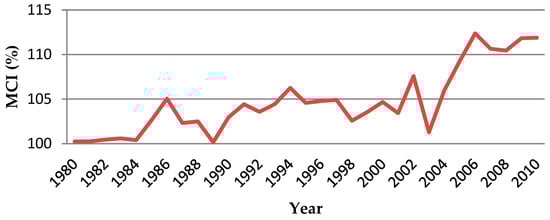 Figure 7) shows that the degree of land use by farmers has been gradually increasing, which can be roughly divided into three stages. In the first stage (1980–1990), MCI increased from 100.23% to 102.96%. It reached the peak point in 1986, which was 105.04% and touched a trough in 1989 at 100.16%. In the second stage (1991–2000), MCI was basically unchanged, rising from 104.41% in 1991 to 104.67% in 2000. In the third stage (2001–2010), MCI rose sharply from 103.42% in 2000 to 111.88% in 2010. During this period, there was a trough in 2003, which was 101.27%, and a peak in 2006, which was 112.37%.