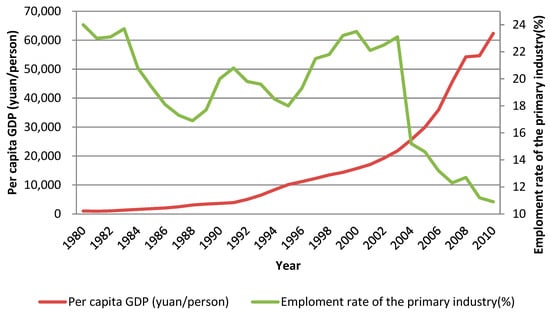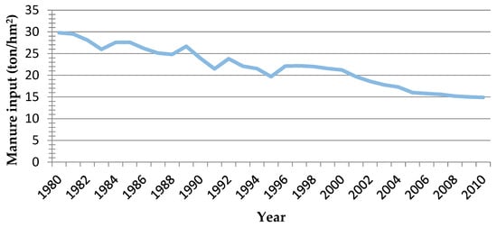Figure 9). It reached 10,125 yuan in 1995, and 15,666 yuan/person in 2000. However, the ratio of labor force engaged in the primary industry was 24% in 1980 and 23.5% in 2000. Although it fluctuated during this period, the overall situation remained relatively stable. In such an external socio-economic environment, farmers chose to plant maize and rice as their main production activities. The planting area of cash crops was increasing slowly. Thus, the increase of LUD was relatively slow. In terms of land input, although the amount of manure input was at a high level, it was in a downward trend as a whole. Such farmers’ land use behavior directly led to a significant decline in the contents of SOM in the study area.