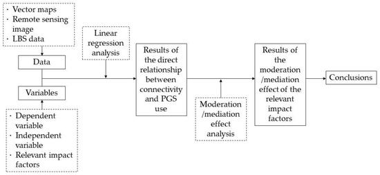 With the research goal, as depicted by Figure 1, the first step is to conduct the general linear regression analysis. The requisite data are the vector map of the study area (Wuhan), the corresponding remote sensing image and the LBS data. The dependent variable of PGS use is represented by the average daily population density mined through the LBS data from Yichuxing; and the independent variable of connectivity among PGSs are calculated by referring to the vector map of the green space of Wuhan. Through this process, it is possible to generate results of the direct relationship between connectivity and PGS use. Then a moderation/mediation effect analysis is executed to check how the relevant impact factors influence the direct relationship between PGS use and connectivity. It is worth noting that there may be different moderation and mediation modes which entail more than one moderation/mediation effect analysis in this process. By integration of these results, then it is possible to draw the conclusions that would answer the question as stated by the title of this paper.