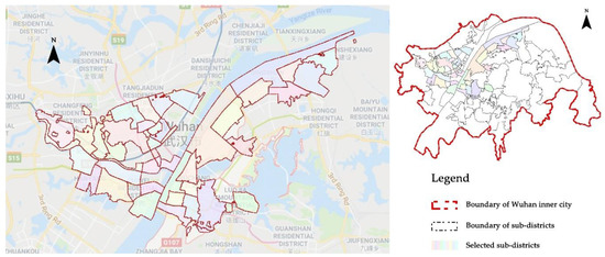 In light of the above facts, it is significant to examine the relationship between the connectivity of PGS and its use in Wuhan, particularly the inner urban area. Considering the situation that the construction and management of most green space, as well as the census is consistent with administrative division, we take the sub-district as the basic analysis unit. On the one hand, it helps to set a standard unit for all the data; on the other hand, it would make the application of conclusions to urban management practice easier. Here we select 42 such units from the old town areas of Wuhan. As depicted in Figure 2, most of them are small in size and clustered alongside the Yangtze River and the Han River.