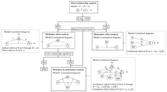 As described in Figure 3, we deploy Model 1 first to analyze the correlation between the independent variable X (IIC) and the dependent variable Y (PGS use) without consideration of any other factors. If the correlation between IIC and PGS use exists, then we will apply Model 4 and directly take those related factors as the moderators to analyze their influence on this relevance. However, if there is no statistically significant relevance between them, then we will suppose that some impact factors might mediate the relevance between them. That is to say, connectivity (IIC) may need the mediation of other impact factors to exert influence upon PGS use. Using Model 2, we can test this guess. If the indirection effects of IIC on PGS use, namely ab in Figure 2, are statistically significant, this means that the supposition at this step is acceptable and IIC cannot affect PGS use independently. In this circumstance, we then need to proceed to examine how PGS use is influenced by IIC with the mediation of these identified factors, and whether the rest of the selected factors have an impact through this pathway (Model 3).