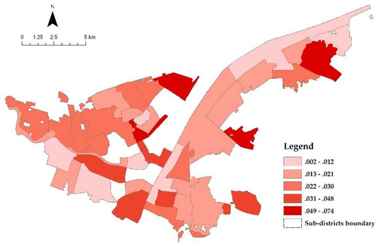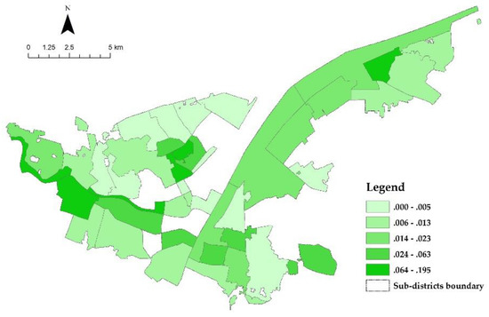 Compared with the data of a traditional survey, the data from Landsat remote sensing is faster, more objective, lower cost, wider range, multi-temporal, and non-destructive [67]. Hence, NDVI derived from it can objectively reflect the actual greenness of land cover. A remote-sensing image was obtained from Landsat8 (OLI_TIRS) on 23 July 2016, with a resolution of 30m * 30m. After processes of radiometric correction, atmospheric correction, etc., near-infrared bands and visible red bands are extracted. Then the value of NDVI is calculated. Accordingly, mean NDVI and green space quality within each sub-district can be obtained. Using Landsat to acquire NDVI data is one of the important applications, but because of the influence of aerosol optical thickness, certain bias may exist in term of the quality of the NDVI data [68,69].