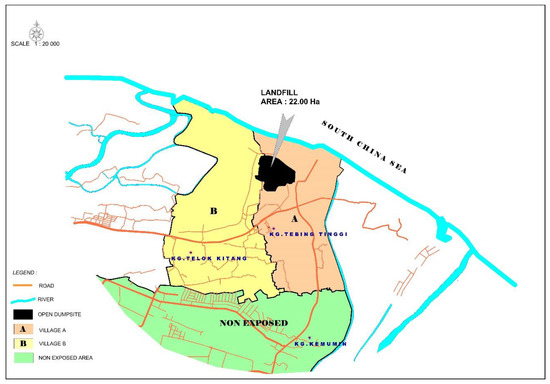 The exposed subjects were residents within a 1 km radius of the dumpsite [17]. The two villages that surround the dumpsite were included. The population data of residents in those villages were provided by the Health Department. The data showed that village A had 223 houses with 976 residents while village B had 260 houses with 1281 residents. Approximately 483 inhabited households were in the defined area with a radius of 1 km. The non-exposed subjects were residents between a 2.5 and 4.0 km radius from the dumpsite. One village was selected for the non-exposed area which had 371 houses with 1760 residents. The village is right next to the exposed villages and chosen because we would like to control the similarity of other environmental exposures other than the dumpsite, such as industrial activities, roads, and motor vehicles. The maps of the dumpsite and selected villages provided by the Kelantan Department of Survey and Mapping are shown in Figure 1 and Figure 2.