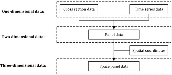 From time series, cross-section data and panel data to spatial panel data, it is easy to find that the dimension of data and the capacity of samples are growing, and the information available for mining is also increasing geometrically with the change of data representation methods. The relationship of the several data representation methods is shown in Figure 4.