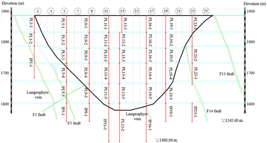 In the following, 42 typical measuring points on No. 1, No. 5, No. 9, No. 11, No. 13, No. 16, No. 19, and No. 23 dam sections are used to establish the hybrid model. From 1 November 2013 to 31 December 2018, the upstream water level mainly changed between 1700 m and 1880 m. In the process of determining the hydraulic component in the finite element model, the upstream water level is selected every 5 m between 1700 m and 1880 m. A total of 37 sets of hydraulic loads are calculated by finite element method.