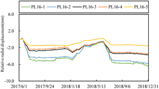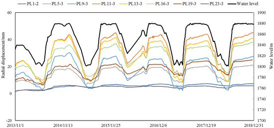 According to the radial displacement data of Jinping-I arch dam from 1 November 2013 to 31 December 2018, a hybrid model is established. The hydraulic component is determined according to the finite element model on different water level, and the temperature component and time effect component are determined by the statistical model. Figure 15 shows time series of several radial displacement of some dam sections and water level. We can see that the deformation is greatly affected by the change of water level. Therefore, in the FEM model analysis, water level is an important factor to be considered.