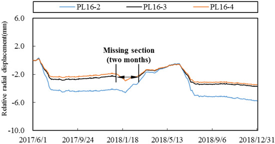 Time series of several radial displacement of some dam sections and water level.