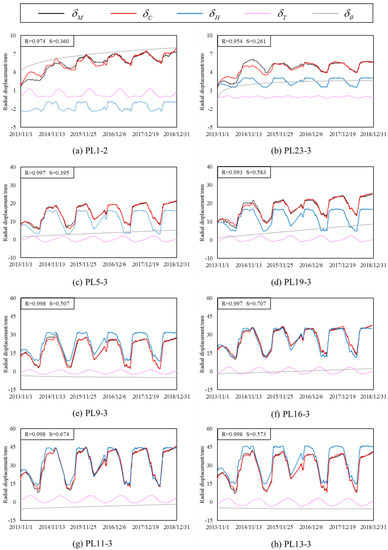 Table 8 shows the coefficients of the hydraulic component, temperature component, time effect component, and constant term of the hybrid model, that is, the coefficients in Equation (27).