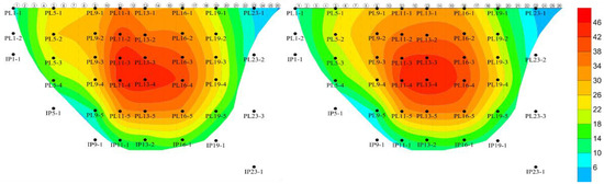 Table 10 shows the correlation coefficient and residual standard deviation of the spatiotemporal hybrid model of the typical pendulums of the dam body. The correlation coefficient shows that the fitting accuracy is good, while the residual standard deviation is larger than that of the single point hybrid model. However, considering that the measured values of the spatiotemporal hybrid model include all the measured points, the fitting accuracy of residual standard deviation is still high in the spatiotemporal model. Table 11 shows the spatiotemporal hybrid model coefficients in detail. Figure 18 shows comparison nephogram between the measured value and calculated value of radial displacement of dam body on 31 December 2018. It can be seen from Figure 18 that the fitting effect of the model is good.