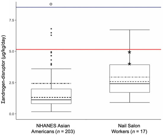 Comparison of cumulative phthalates daily intake (Σandrogen-disruptor) between nail salon workers and NHANES 2011–2012 Asian Americans. Boxes represent interquartile range (IQR: 25th–75th percentiles). Dark lines represent medians. Dashed lines represent geometric means. Dot-dashed lines represent arithmetic means. Whiskers extend to min and max (Max = most extreme values within 1.5 • IQR of the median for NHANES). NHANES outliers are represented by dark points, and hollow point denotes outliers off the y-axis scale (a total of seven, five of which were women). Red line represents 95th percentile for pooled NHANES Asian Americans (n = 203). Blue line represents 95th percentile for female NHANES Asian Americans (n = 97). p-value of statistical tests of difference between nail salon workers and NHANES Asian Americans <0.0001. * Indicates male nail salon worker observations (n = 2).